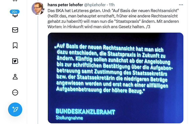 hans peter lehofer dazu: "Die Bezüge von Staatssekretär:innen sind in § 3 Abs 1 Z 7 und Z 10 Bundesbezügegesetz ganz klar geregelt: ris.bka.gv.at abhängig davon, ob sie mit bestimmten Aufgaben betraut sind oder nicht. Man könnte also ins Gesetz schauen oder man gibt ein Gutachten in Auftrag.