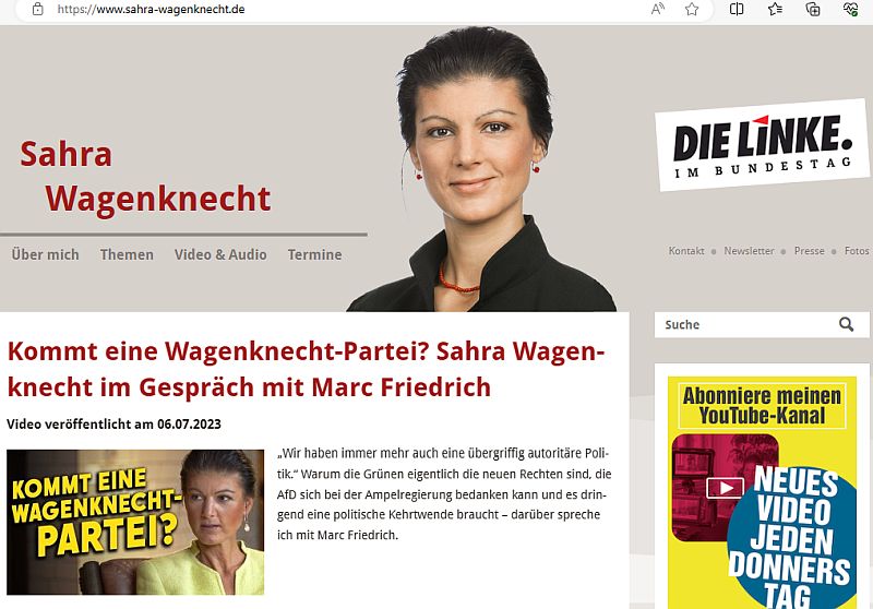 Nun versucht es nach dem gleichen Modell laut Gerüchteküche die seit Jahrzehnten erfolgreiche LINKE Sarah (neuerdings: Sahra) Wagenknecht. Vor zehn Jahren hielt ich sie für die intelligenteste Deutsche - und die attraktivste noch dazu. Dann kam eine laue Abrechnung mit der Selbstgerechtigkeit der Linken, doch sich selbst hat sie in "Mein Gegenprogramm" (Untertitel des Buches "Die Selbstgerechten" 2021) geflissentlich von der Kritik ausgenommen.