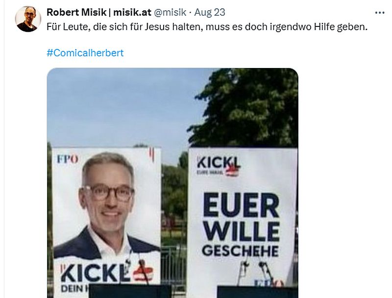 Robert Misik @misik twittert über Kickl: Für Leute, die sich für Jesus halten, muss es doch irgendwo Hilfe geben.