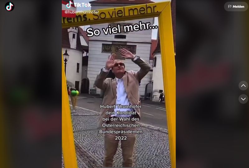 TikTok-Video vom 11. April 2022: Die Message "ein guter Kandidat arbeitet voller Konzentration für Österreich" erreichte (Stand 9.9.22) 106.000 Viewer. Das selbe Video am 23. April nochmals gepostet erreichte bis dato sogar 161.000 Zugriffe!